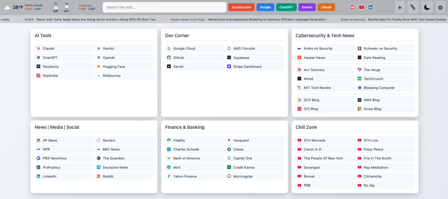 Every new tab in my browser was wasted real estate: either a blank page or cluttered with "recommended" content I didn't ask for. Browser bookmark managers are functional but uninspiring, and cloud-based start pages raise privacy concerns and require accounts.